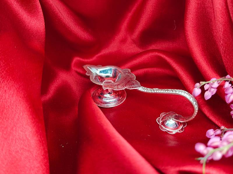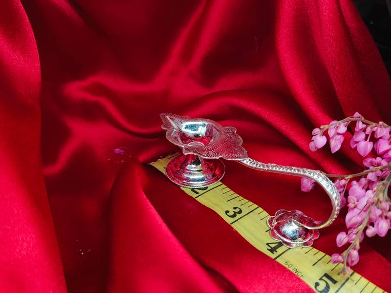 The Silver Aarti Diya is a gleaming beacon of reverence, crafted to elevate every sacred ritual—from the radiant nights of Diwali to the vibrant chants of Navratri and beyond. Made from pure silver, this diya is designed to hold multiple wicks, creating a mesmerizing flame that dances in sync with the rhythm of devotion during aarti. Its reflective beauty not only enhances the ceremonial glow but also symbolizes the offering of light to the divine—an invitation of peace, purity, and blessings into the heart of the home. Whether used in daily puja or during grand festivities, the silver Aarti Diya becomes a cherished centerpiece of spiritual celebration.