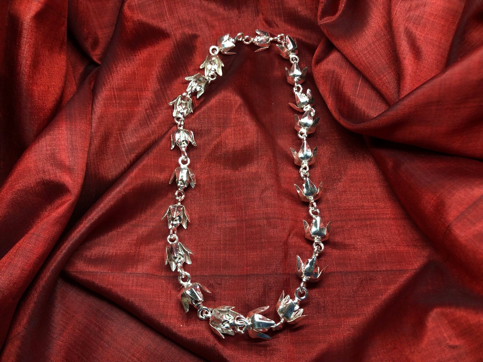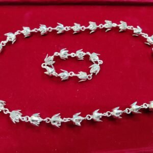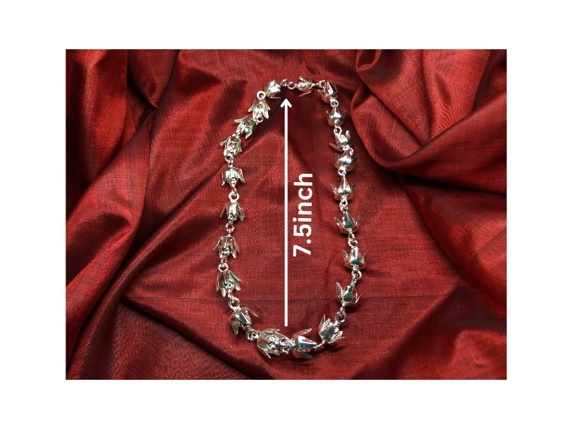 The Silver Akondo Flower Garland is a striking expression of fierce devotion, strength, and divine reverence. Inspired by the Akondo bloom—known for its resilience and often associated with Maa Kali and Shiva rituals—this garland carries a deep spiritual intensity. In Bengali traditions, Akondo flowers are offered to powerful deities, symbolizing fearless surrender and unshakable faith. When reimagined in pure silver, each bloom radiates permanence and grace, capturing the essence of fiery devotion in an unwithering form. Draped around idols or placed upon sacred altars, the Silver Akondo Mala becomes a bold offering of divine connection, protection, and truth.
