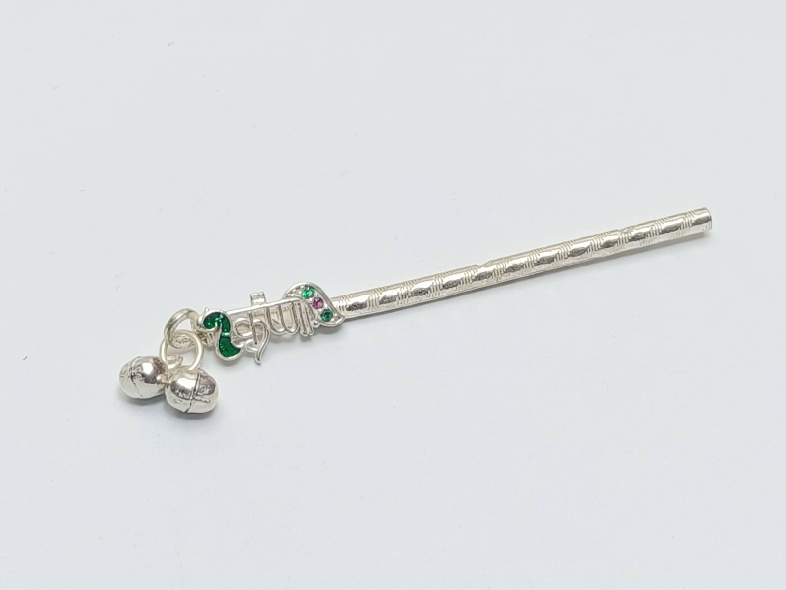 A perfect accessory to go with your Krishna idol, comes with a peacock, intricately carved towards the end of the flute. A chain that hangs along with it gives it the finishing touch. A beautifully hand-crafted silver jewelry.