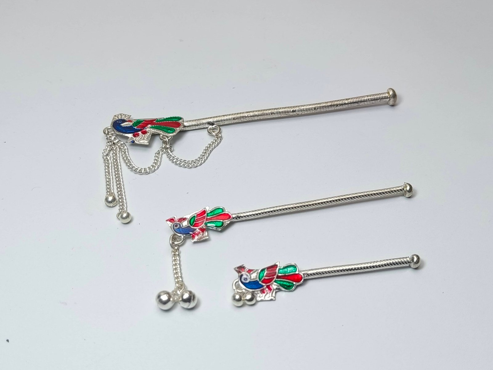 A perfect accessory to go with your Krishna idol, comes with a peacock, intricately carved towards the end of the flute. A chain that hangs along with it gives it the finishing touch. A beautifully hand-crafted silver jewellery.