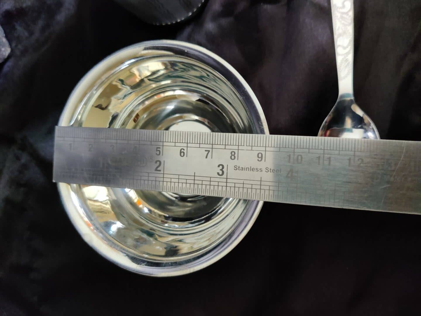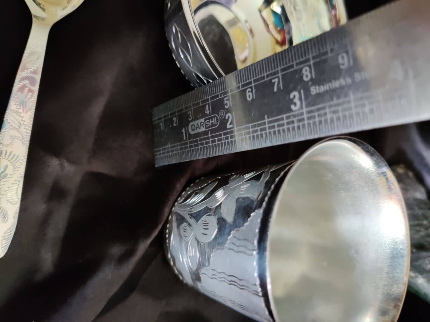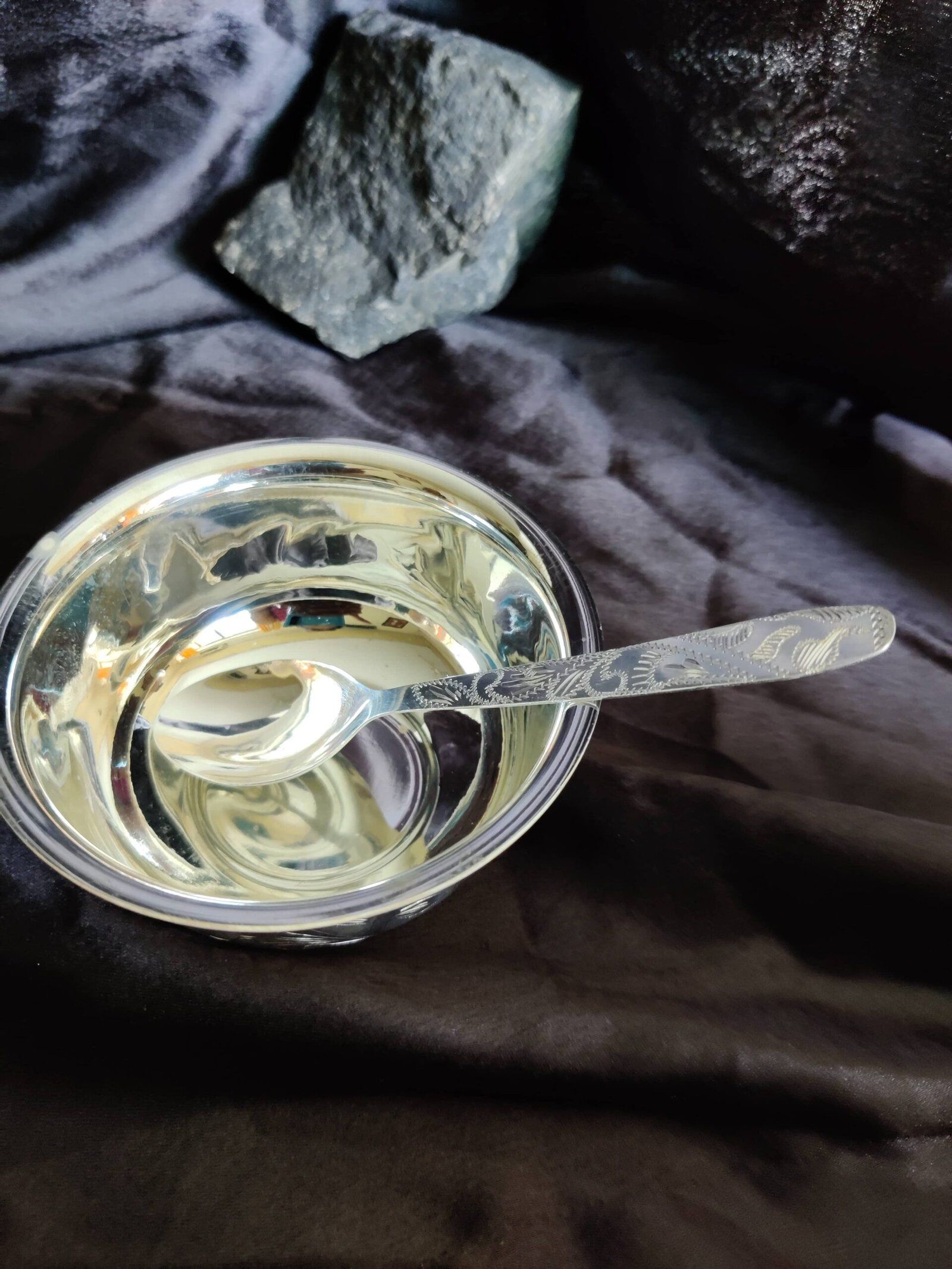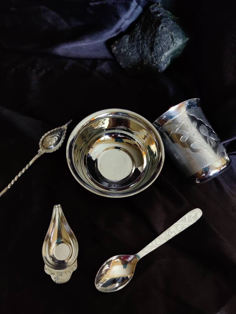 The dinner set includes a Bowl, Glass, Feeding Spoon and Spoon, Kajollota made of Pure silver.