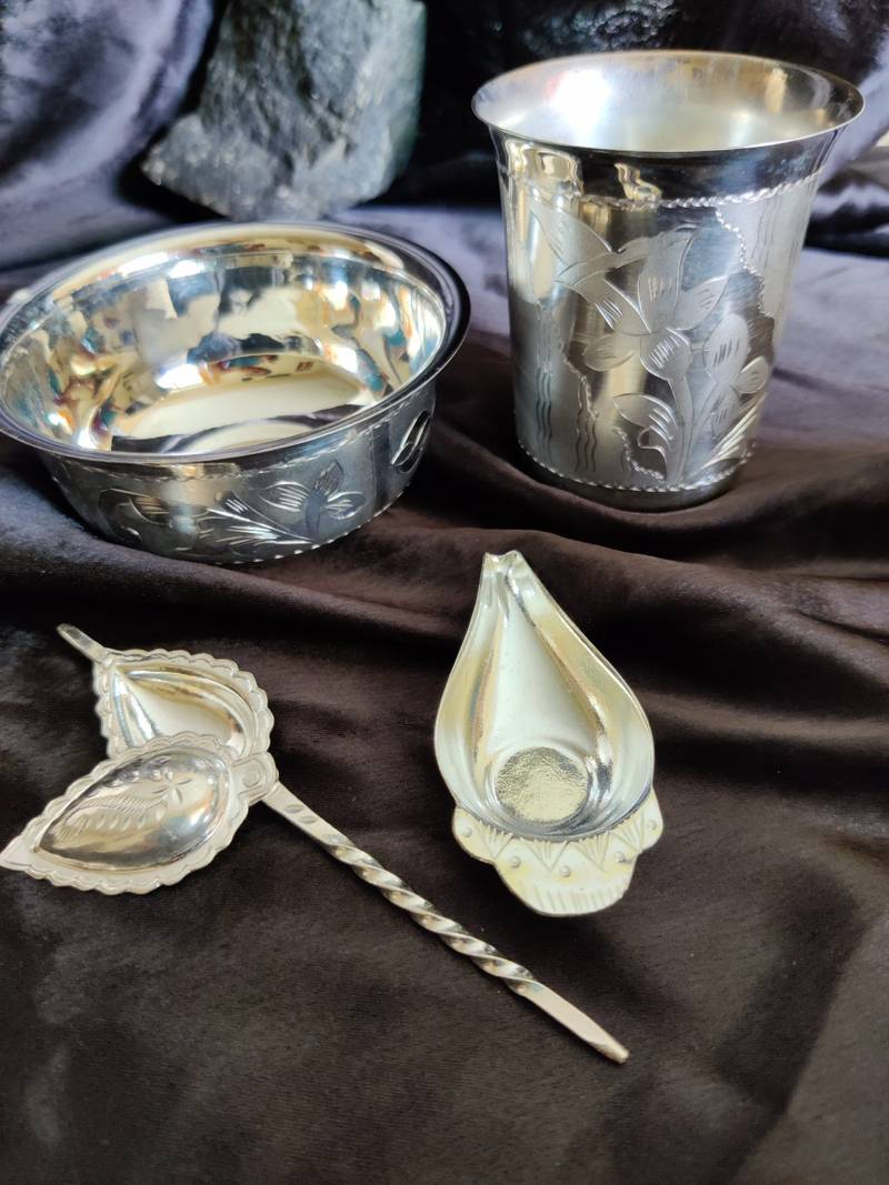 The dinner set includes a Bowl, Glass, Feeding Spoon and Kajollota made of silver.