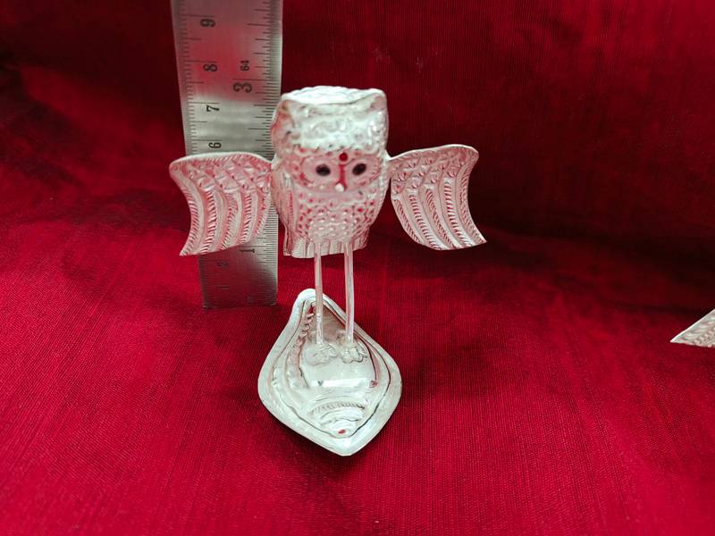 - The Owl Figurine—revered across spiritual traditions and cultural beliefs—is a powerful symbol of wisdom, prosperity, and protection. In Hindu tradition, the owl (Ullu or Pecha) is the vahana (vehicle) of Goddess Lakshmi, representing sharp insight and the ability to see through darkness—a sign of wealth that comes with discernment. In Feng Shui, the owl is a guardian against misfortune and an enhancer of mental clarity and good luck. Crafted as a home décor idol in metal, silver, crystal, or ceramic, the Owl Showpiece is ideal for placing near entrances, on work desks, or in sacred corners to attract abundance, keen vision, and spiritual strength. Whether minimalist or adorned in intricate designs, this owl is more than décor—it’s a sentinel of serenity and success.