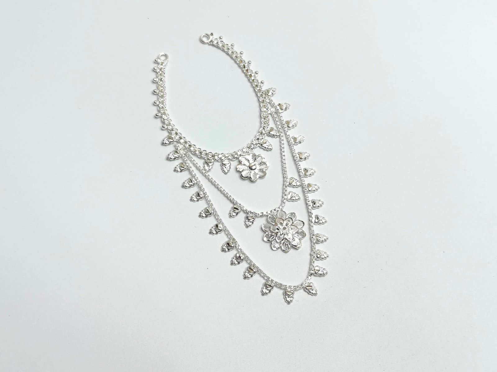 Made from high-quality silver, this necklace features five delicate layers of intricate design, symbolizing purity and devotion. Ideal for adorning idols during festivals, poojas, or daily rituals, it enhances the divine aura and makes your spiritual space more beautiful.