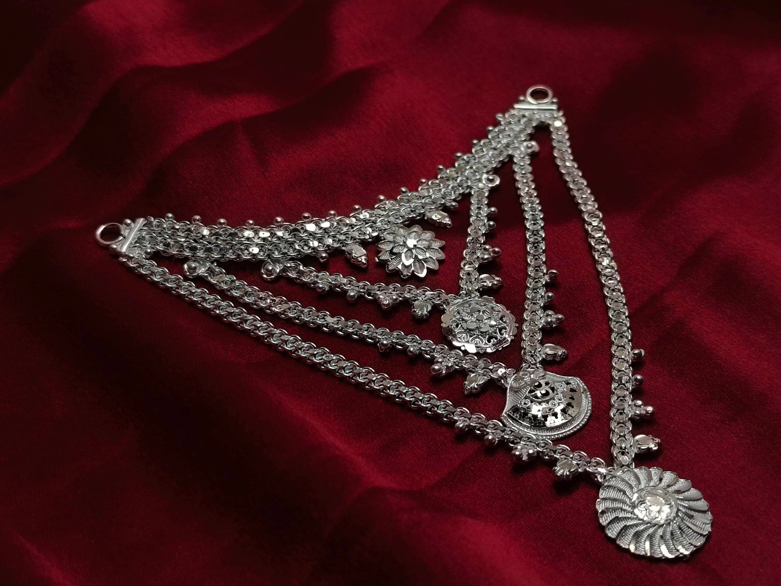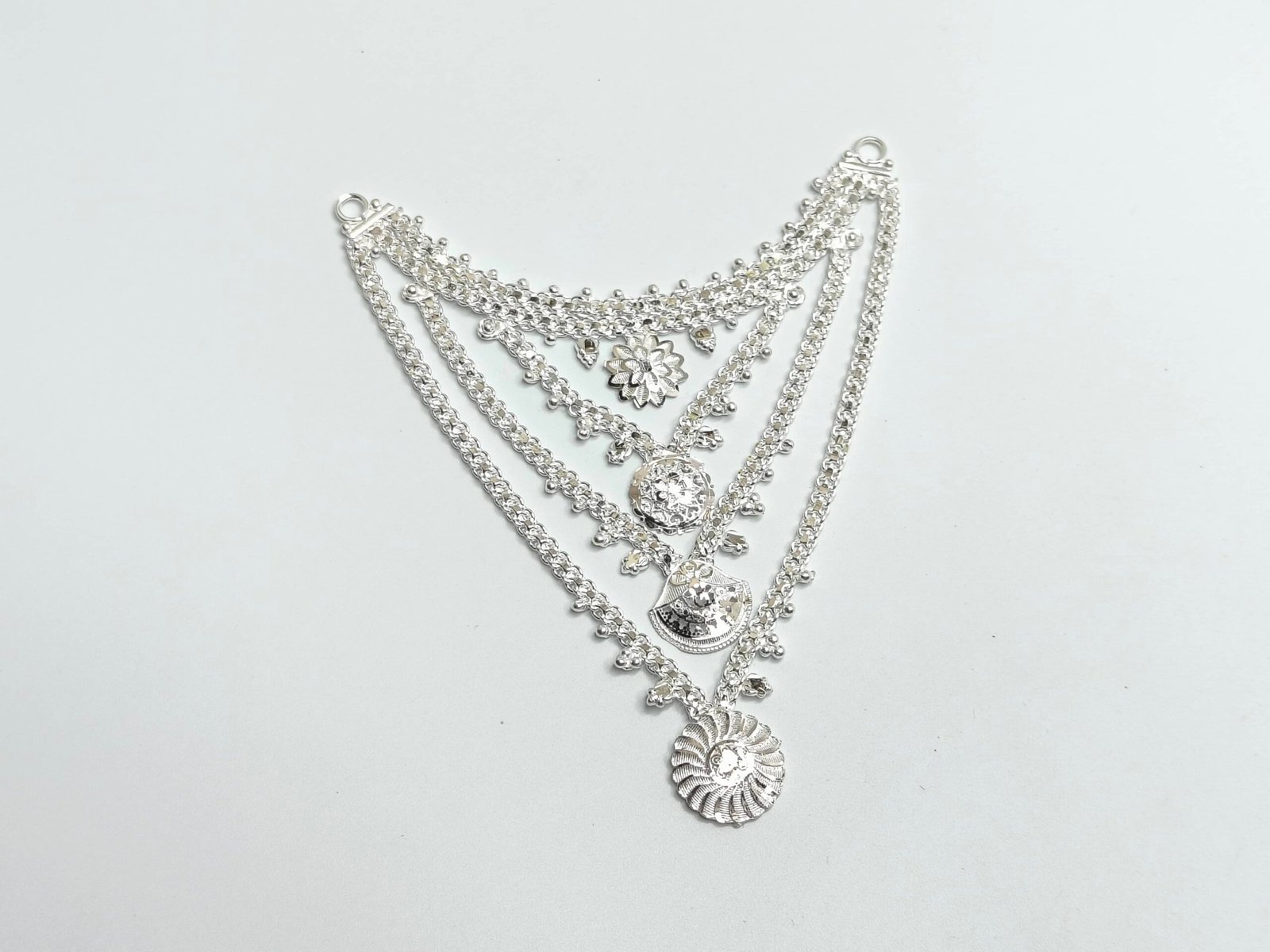 Made from high-quality silver, this necklace features five delicate layers of intricate design, symbolizing purity and devotion. Ideal for adorning idols during festivals, poojas, or daily rituals, it enhances the divine aura and makes your spiritual space more beautiful.