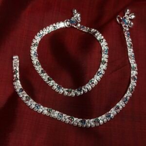 - Let tiny feet sparkle with this adorable silver kids’ Meena payel, crafted with love and a hint of playful color. Accented with traditional Meenakari enamel work, it blends subtle elegance with a burst of vibrancy—perfect for daily wear or festive frolic.