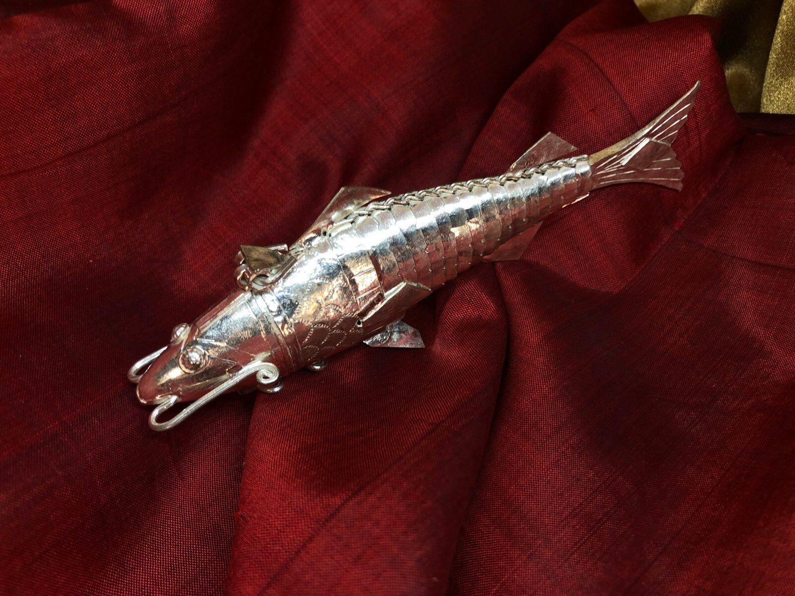 The Silver Fish Kumkum Box is a graceful blend of symbolism and tradition, designed to hold sacred kumkum while inviting abundance and good fortune. In Indian culture, the fish is a revered symbol of prosperity, fertility, and auspicious beginnings—often associated with Goddess Lakshmi and seen as a harbinger of positive energy. When crafted in pure silver and shaped into a charming fish form, this kumkum box becomes more than a utility item—it transforms into a talisman of elegance and well-being. Perfect for wedding gifts, festive offerings, or everyday altar use, it brings a touch of charm to rituals and home decor alike.
